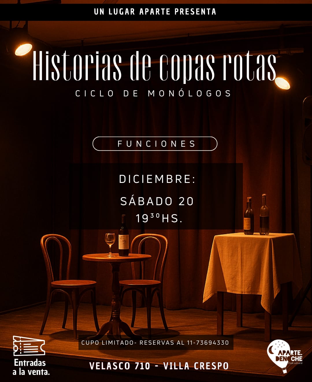 Historias de Copas Rotas es un show de monólogos donde un conjunto de personajes que se cruzan en un bar fuera del tiempo nos cuentan sus historias de amor y odio.